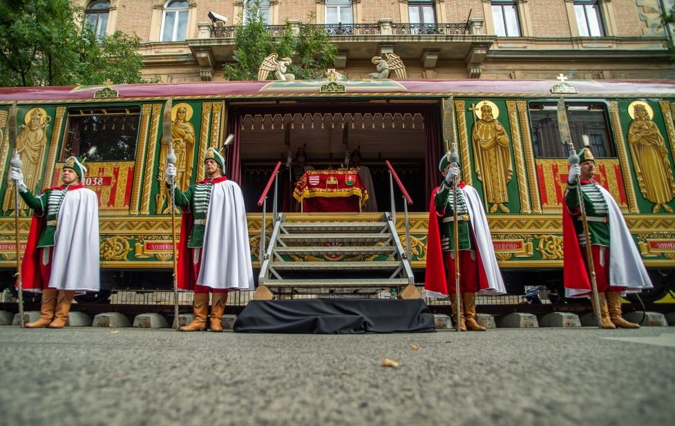 Az eredetileg 1938-ban elkészült, majd a II. világháborúban megsemmisült Aranyvonat újraépített Szent Jobb-ereklyeszállító kocsija az Alkotmány utcában. MTI/Balogh Zoltán