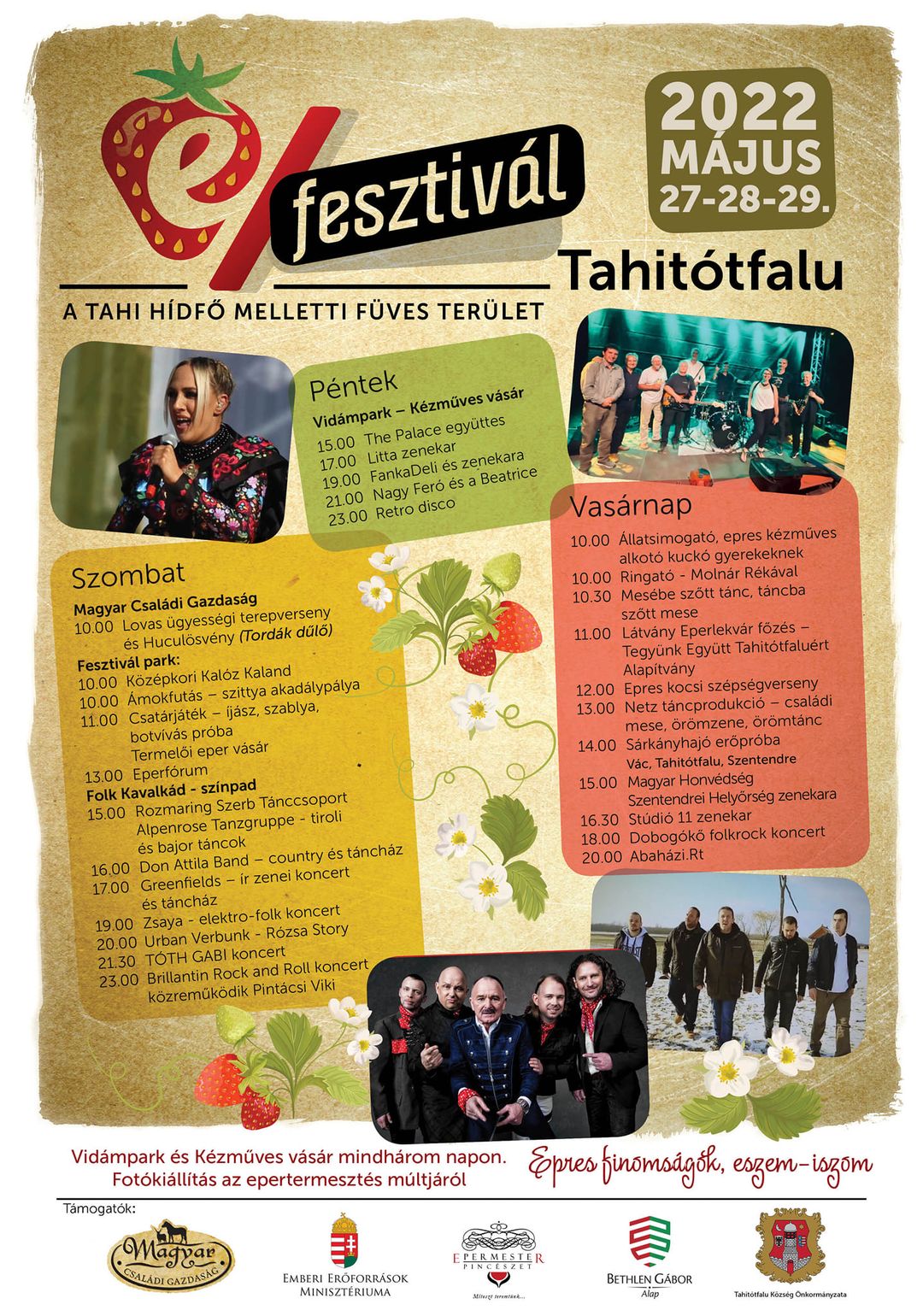 Ilyenkor itt minden az eper körül forog, megtaláljuk mindenféle formájában az epres méztől az eperpálinkáig. De van itt más is, kürtős kalács, sparhelten sült lepény, játszóház, jó muzsika, vidámpark és kézműves vásár, minden ami egy jóízű és jókedvű tavaszi családi fesztiválhoz kell.