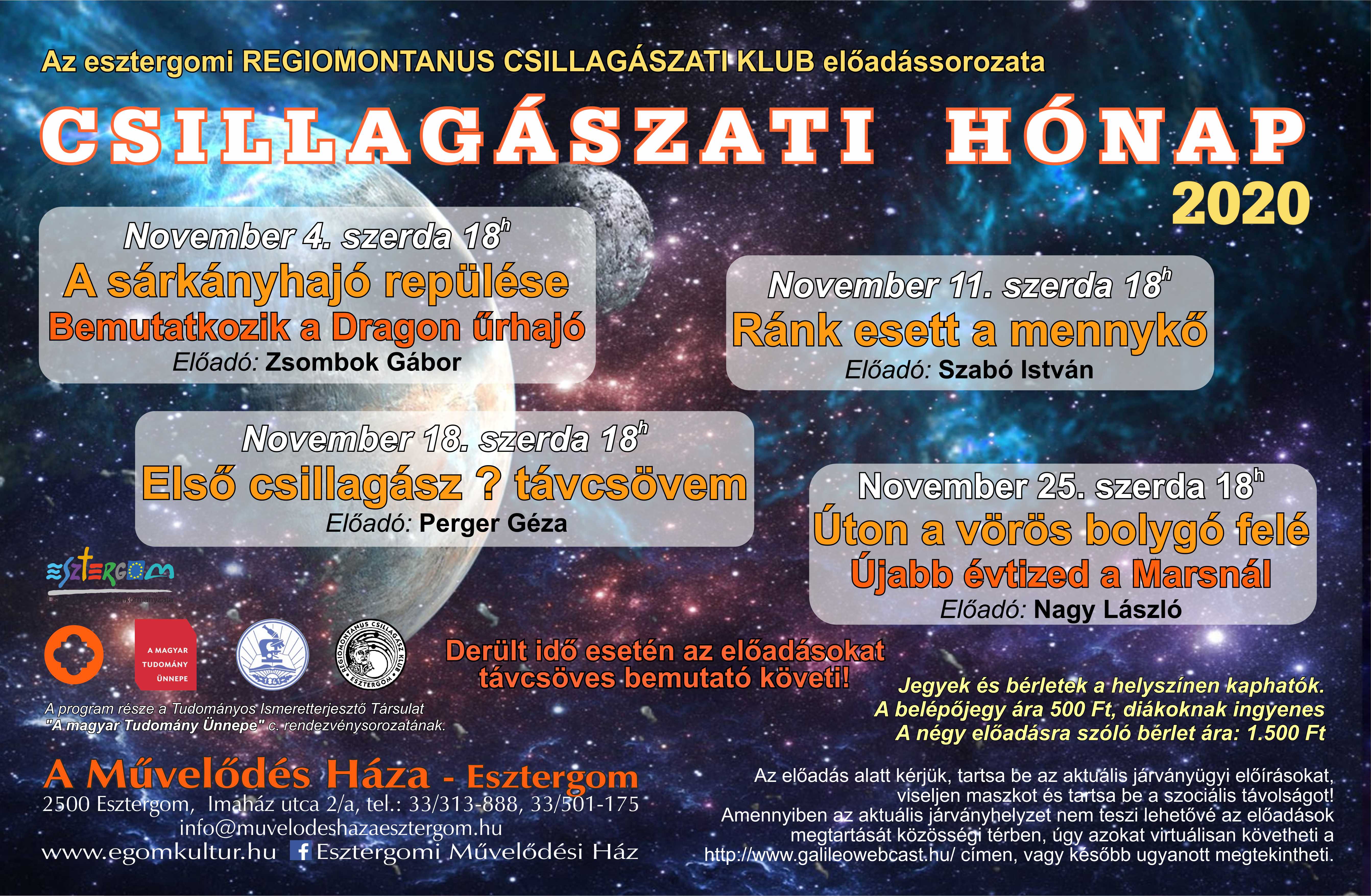 Csillagászati hónap – 2020 címmel indít az esztergomi Regiomontanus Csillagászati Klub előadássorozatot novemberben a művelődési házban.