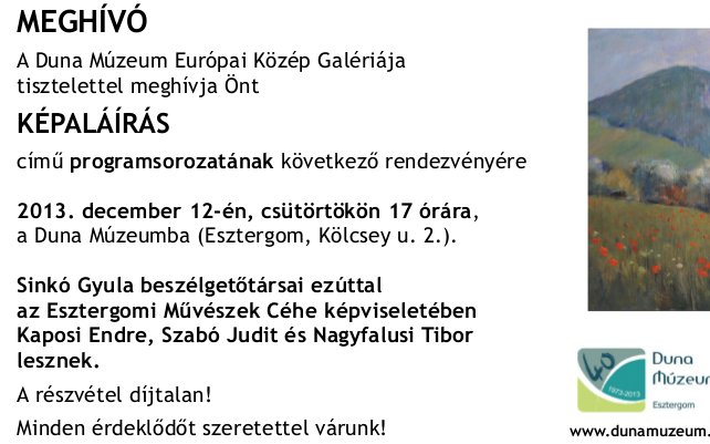 Újabb évet zár le az Esztergomi Művészek Céhe, mely a minap nyitotta meg összefoglaló kiállítását a Duna Múzeumban. E kapcsán zajlik majd le a Képaláírás beszélgetés december 12-én 17 órakor a múzeumban, ahol Sinkó Gyula beszélgetőtársai ezúttal Kaposi Endre, Szabó Judit és Nagyfalusi Tibor lesznek.