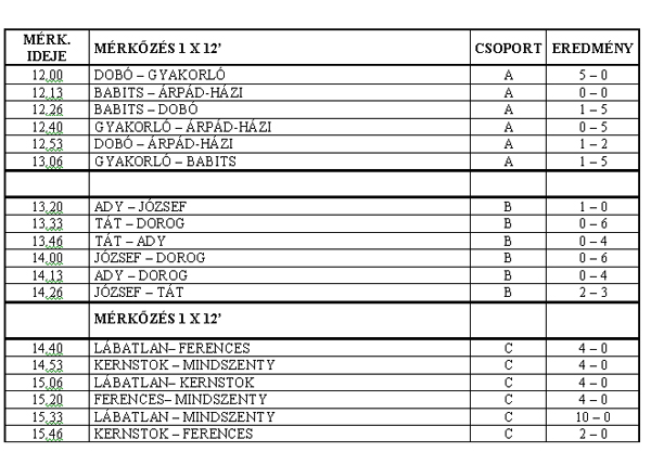 November 15-én zajlottak a selejtezők, melyek során a csapatok 3x4-es csoportokban küzdöttek a továbbjutásért. Az „A” csoport nagyon kiegyenlített volt, hiszen a Gyakorló együttesét mindenki verte, de a továbbjutásban 3 csapat is bízhatott. Végül a Babits iskola szomorkodhatott. A másik két csoportban a Dorog és a Lábatlan kimagasló teljesítménnyel lett csoportelső, de a párkányi Ady és a nyergesújfalui Kernstok is jó teljesítménnyel jutott tovább.