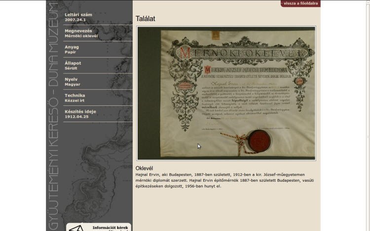 2012 nyarán – a Nemzeti Kulturális Alap Múzeumi Kollégiumának közel 1 millió forintos támogatásával – a múzeum honlapján a meglévő adatbázisra alapozva egy felhasználóbarát, akár alapszintű internetes tapasztalatok birtokában is egyszerűen használható gyűjteményi keresőt indítottunk el. Ennek tervezése és megvalósítása során már nemcsak egy szűk szakmai kör, hanem a nagyközönség, az érdeklődő látogatók igényeit is igyekeztük szem előtt tartani.